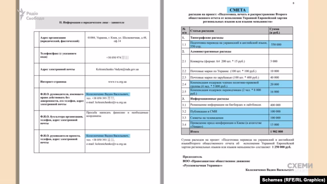 “Схеми” з’ясували, що Колесніченко отримував фінансування від “Правфонду” для підтримки цього закону як до його ухвалення, так і після. Зокрема, у лютому 2012 року, за півроку до прийняття закону, Колесніченко звернувся до “Правфонду” з проханням виділити 1,9 мільйона рублів (приблизно 65 тисяч доларів за тогочасним курсом) на підготовку та поширення альтернативного звіту про нібито невиконання Україною міжнародного договору Ради Європи — Європейської хартії з регіональних мов, яка діяла в Україні з 2006 року та мала на меті захист мов, що перебували під загрозою зникнення, серед яких була й російська, йдеться в розслідуванні.