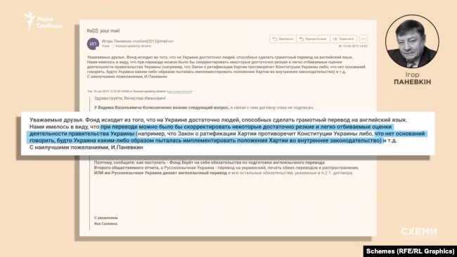 “Схеми” встановили, що, крім грошей, Москва надавала Колесніченку вказівки про те, що саме писати у своєму «громадському звіті» для Ради Європи. Інструкції депутату Верховної Ради надходили особисто від тодішнього керівника «Правфонду» Ігоря Панєвкіна.